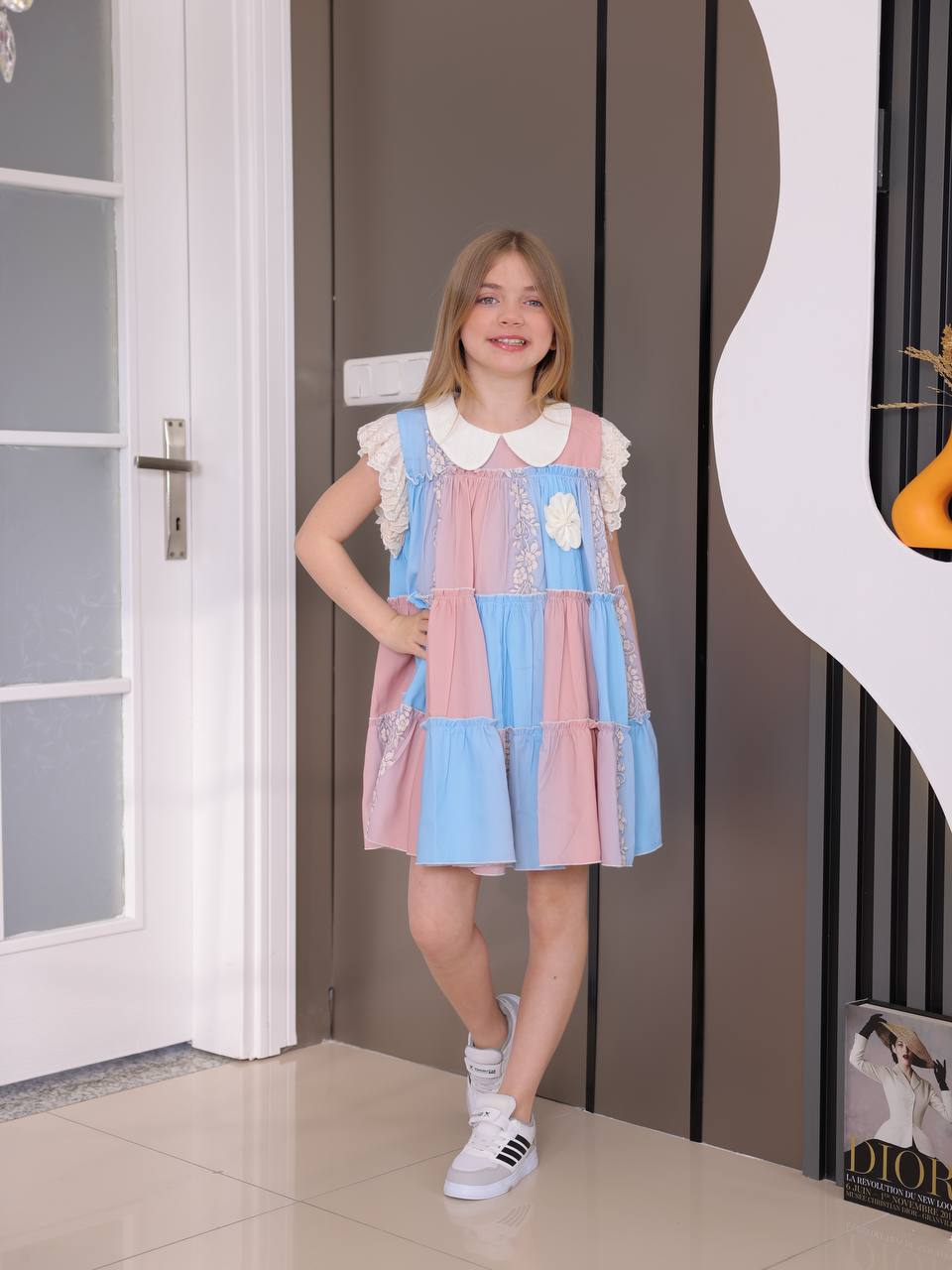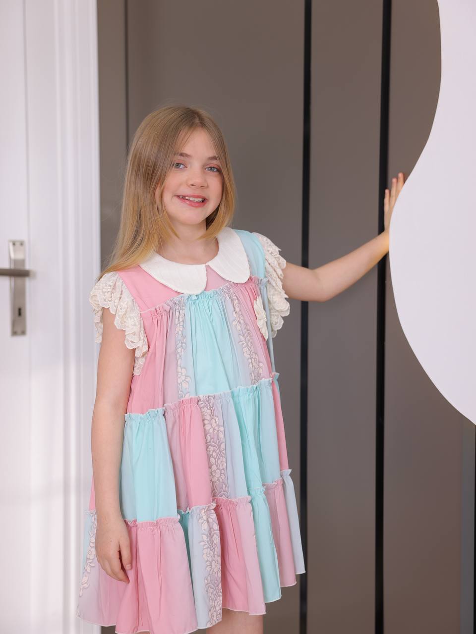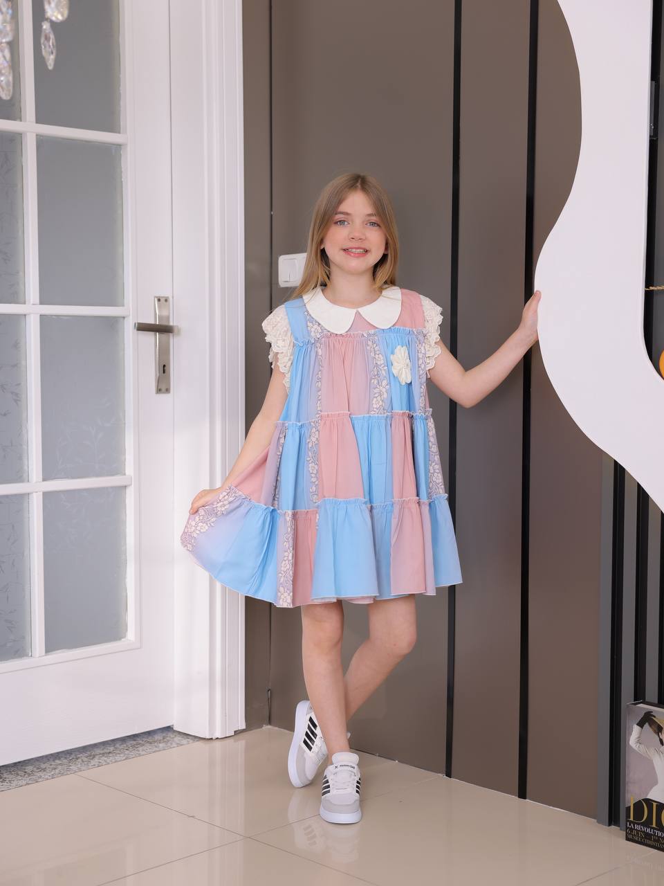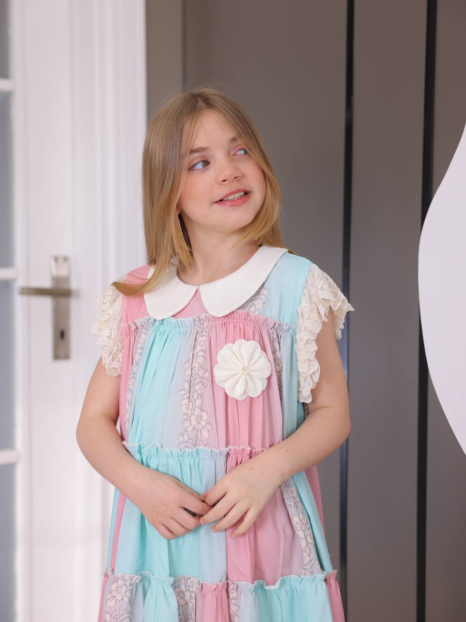 • Yarım Balon Kollar: Elbisenin kısa, hacimli balon kolları hem modern bir hava katar hem de çocukların hareket özgürlüğünü kısıtlamaz.