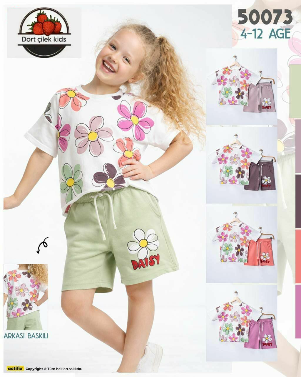 Bu model, hem ön hem de arka kısmındaki yoğun papatya desenleriyle dikkat çeken oldukça şık bir settir. Yazın neşesi bu takımda! 50073 Serisi, her yerinden çiçekler açan tasarımıyla küçük hanımların enerjisine enerji katacak. Hem önü hem de arkası baskılı tişörtü ile her açıdan kusursuz bir şıklık sunuyor. Çift Taraflı Baskı Şıklığı: Tişörtün hem ön hem de arka yüzü büyük ve renkli papatya desenleriyle bezelidir.