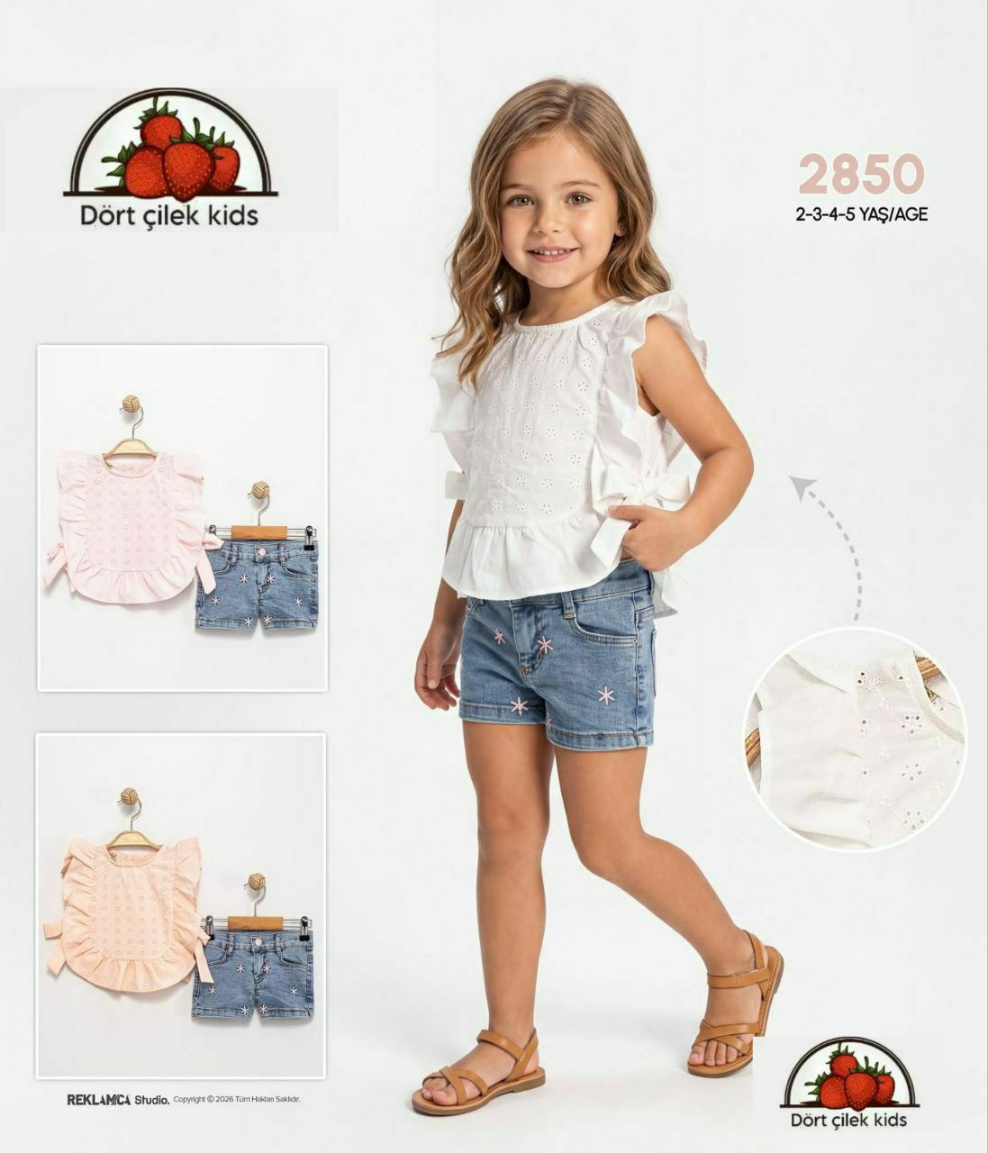 Küçük hanımların yaz şıklığına zarafet katacak, masalsı bir set! Geleneksel fisto nakışının modern denim şortla buluştuğu bu takım, hem doğum günü partileri hem de şık yaz gezmeleri için kusursuz bir tercih. Her detayında zarafet ve konfor gizli.