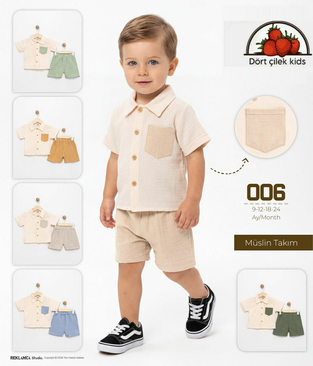 Doğallığı şıklıkla buluşturan 006 Serisi Müslin Takım, miniklerin hassas cildi için en sağlıklı tercihi sunuyor. Klasik gömlek yaka tasarımıyla hem günlük kullanımda hem de özel günlerde bebeğinizin zarafetini tamamlar. Ürün Detayları & Avantajları: